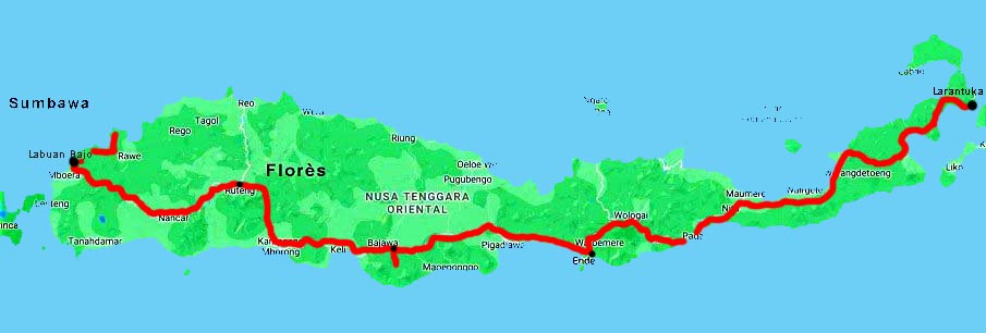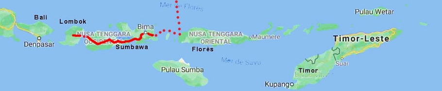 Parcours Indonésie 2 = Lombok : 700 km (y compris traversée Sumbawa / Lombok) (84300) + Sumbawa : 900 km (85200) + Florès : 800 km (86000) + Timor : 300 km (86300) = 2700 Km