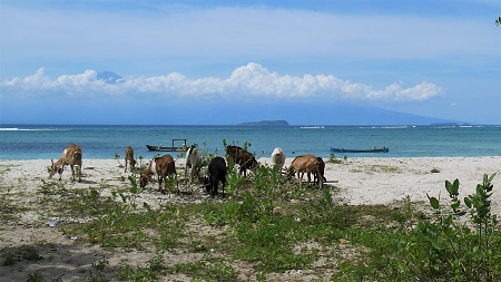 Ce matin, le ciel est dégagé - nous prenons un bateau pour rejoindre Gili Air, l'ile la plus proche de Lombok (15 minutes de navigation). Tout l'Est de l'ile est bordé de belles plages de sable blanc et d'un récif riche en poissons colorés - idéal pour le snorkeling. Dommage que de nombreux détritus jonchent ces lieux paradisiaques !