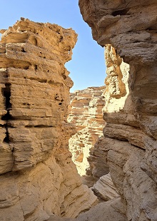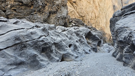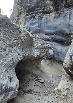 Après une descente vertigineuse nous arrivons à l'entrée du "Snake Canyon" (les gorges du serpent), une gorge étroite et profonde de 3 km qui se tortille comme ..........un serpent. Après 300 m de marche, des rochers bloquent le passage, impossible d'aller plus loin sans matériel. Temps sec (pas comme en 2017), on bivouaque dans le lit du wadi.