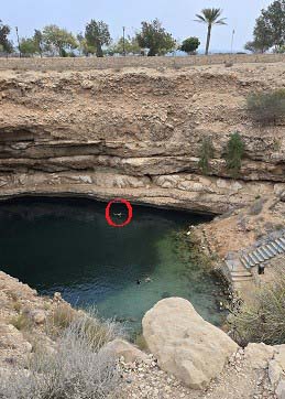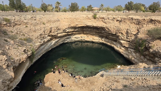 Le gouffre de Bimah - Bimah Sink Hole, Ø 40 m, prof 20 m - est un immense effondrement calcaire dont les eaux bleu-vert invitent à la baignade. Cette piscine naturelle est surnommée Al Bayt al-Afrit "La Maison du Démon".