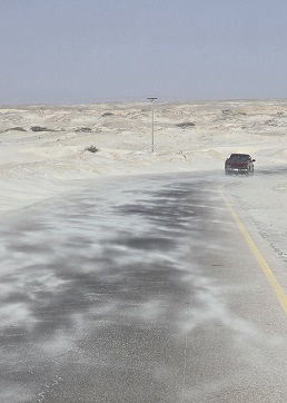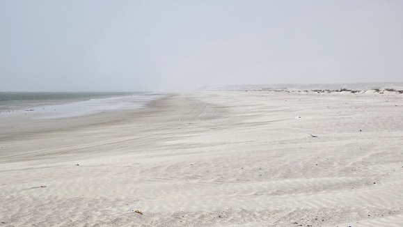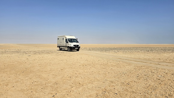 Bivouac sur la plage de Salwa - comme à l'aller. Ce matin au réveil le soleil est voilé, dans le désert, la tempête fait rage - conduite difficile, le vent nous fait faire des embardées et la visibilité est presque nulle, on distingue juste quelques troupeaux de chameaux égarés au milieu des dunes et les bulldozers qui "nettoient" la route.