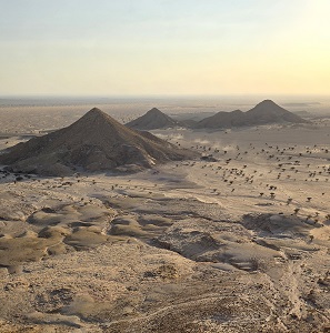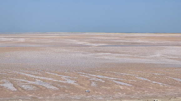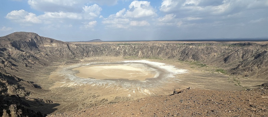 Aujourd'hui, nos routes se séparent, alors que nous roulons vers l'ouest, les Morel descendent vers Narjan. 300 km de bonne route nous conduisent à Al Waba Crater - ce cratère circulaire mesure 3 km de diamètre et 350 m de profondeur. Le fond qui est tapissé de phosphate de sodium blanc tranche avec le noir de la roche basaltique.