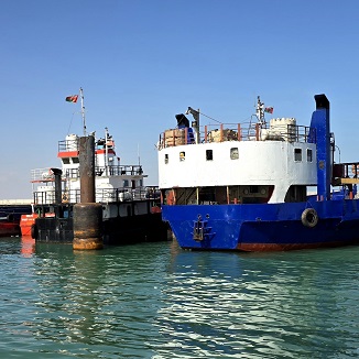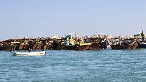 Dans le port de Sour de nombreux boutres (dhows) sont amarrés le long de la longue digue décorée de peintures murales.