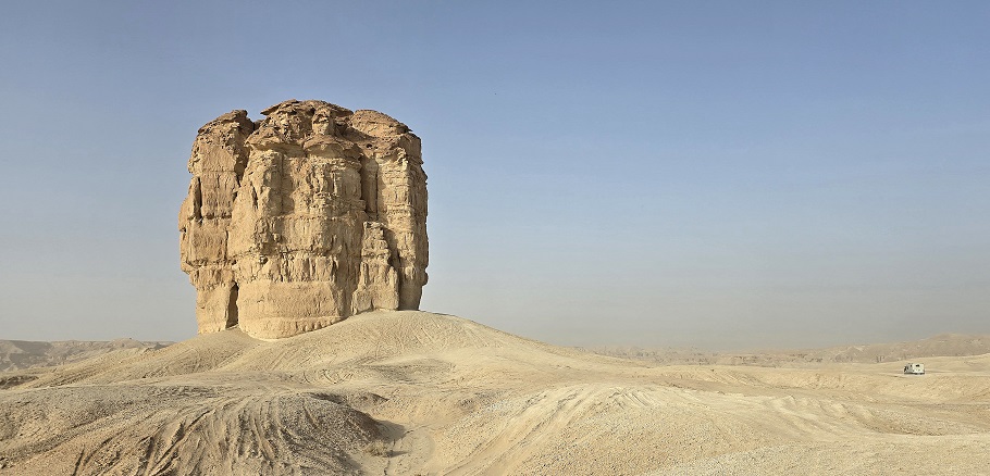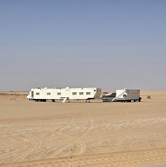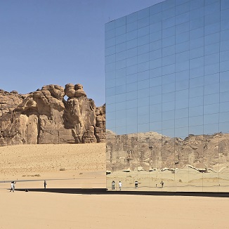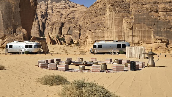 Aujourd'hui, le vent est tombé et le ciel est uniformément bleu. Tant mieux car la visite du complexe de Maraya et des hébergements AirStream (15 km d'AlUla) sera d'autant plus spectaculaire !