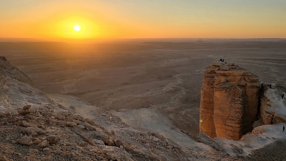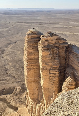 Un petit tour chez Mc Do pour manger des bonnes frites - y en a marre du riz biriani / poulet - il nous reste 20 km de piste "tôlée" et nous voilà arrivés à 1100 m d'altitude à "The Edge of the World". Ces pitons rocheux offrent une vue panoramique sur la falaise de Tawaiq et sur la plaine 300 m plus bas. En fin de journée, des dizaines de Toyota déversent leurs clients qui viennent admirer le coucher de soleil.