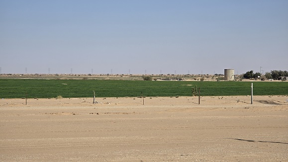 Nombreuses cultures de céréales et de foin pour les chameaux irriguées en cercles.