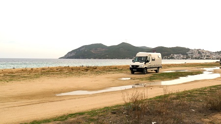 La nuit dernière nous avons dormi sur un terre plein qui domine le lac salé d' Orumiyeh . Avec le temps couvert, nous n'avons pas vu grand chose, mais des automobilistes de passage nous ont vu (on étaient pas cachés) et ont du appeler la police (ou les militaires) !