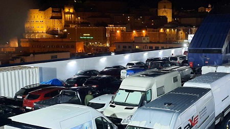 Entre les 2 postes de douane, gros "trafic" de bagages et de carburant - d'ailleurs les trottoirs sont gras et glissants. Des centaines voitures stockées dans tous les sens nous obligent à faire du gymkhana pour prendre la route.
