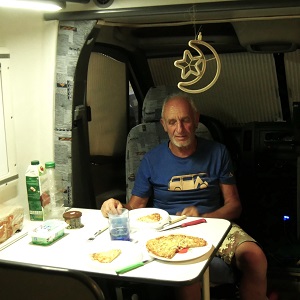 Aujourd'hui, c'est jour de fête, on shampooine le Sprinter qui en avait bien besoin et je fais tourner un pneu avant qui est plus usé à l'intérieur. Repas "take away" 7 € pour 2 et on est bien servi !